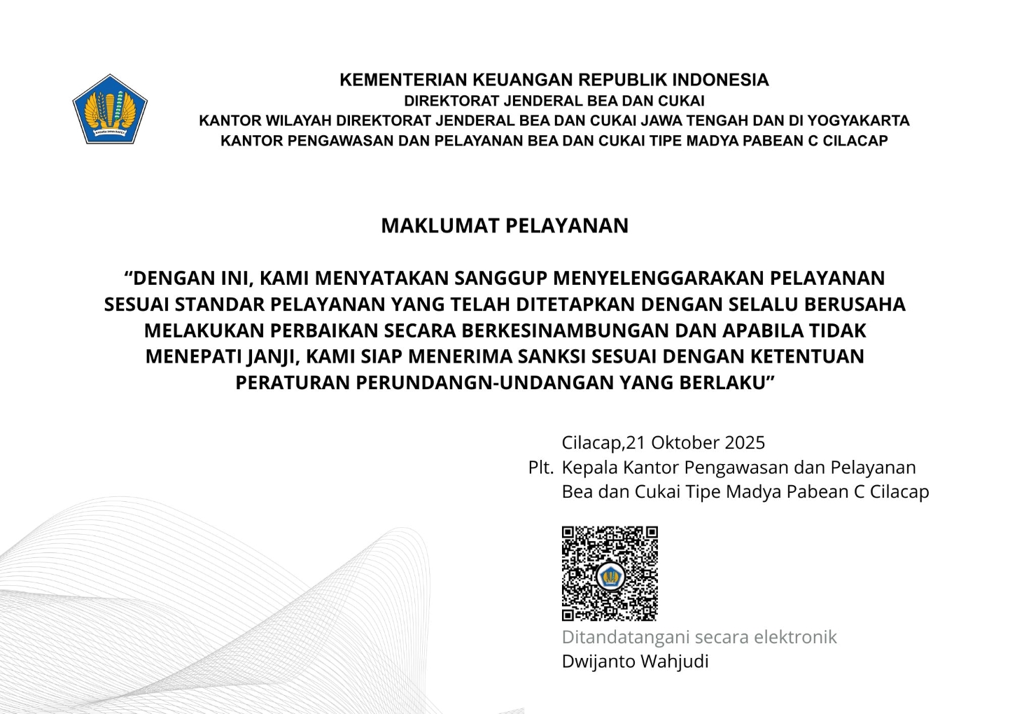 Bea Cukai Cilacap memberikan Kompensasi Pelayanan berupa Souvenir Kantor apabila pelayanan kami tidak sesuai SOP dan adanya keterlambatan pelayanan.