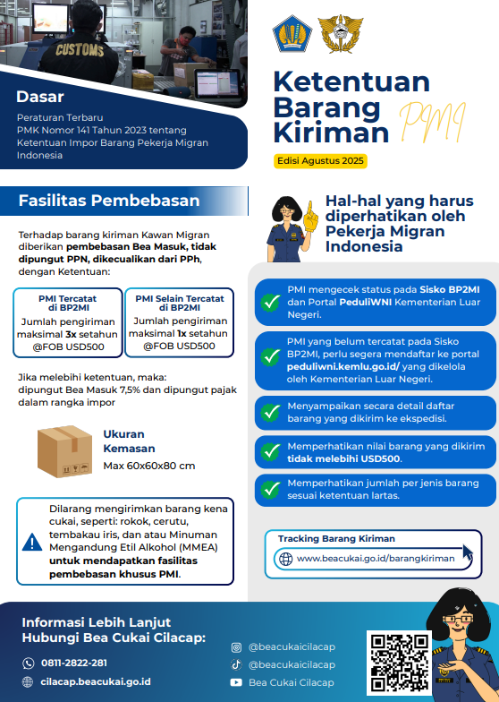 Masyarakat dapat mengetahui syarat pembebasan bea masuk dan PPN, ketentuan nilai maksimal barang, ukuran kemasan, serta jenis barang yang dilarang untuk dikirim. Selain itu, leaflet ini juga memuat panduan bagi PMI untuk memastikan status terdaftar dan tata cara pengiriman yang sesuai aturan.