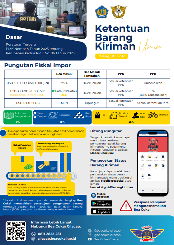Masyarakat dapat memahami kategori nilai barang, fasilitas pembebasan, serta tarif yang berlaku untuk berbagai jenis komoditas. Selain itu, leaflet ini juga memberikan panduan terkait perhitungan pungutan, pengecekan status barang kiriman, serta ketentuan larangan dan pembatasan (lartas).